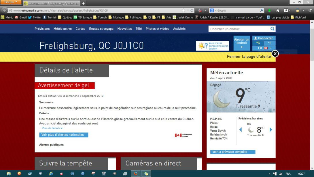 Sun.8.Sep: 7.48 NOT ONE! NOT ONE FUCKING REPLY TO MY TWITTER REQUEST FOR INFORMATION ON HOW BEST TO CARE FOR THE KITTEN!!!!! NOT ONE FUCKING LAZY CUNT OR PRICK COULD TYPE ANYTHING AT ALL! NOT ONE! FUCK FUCK FUCK FUCK FUCK FUCK FUCK!!! OK? BULLSHIT! THE ENTIRE LOT OF THEM! PLAIN, SIMPLE BULLSHIT! 4-FUCKING-HUNDRED AND NINETY-FUCKING-SEVEN FUCK-ALL FUCKTARDS. MISERABLE BLOODY SHITS! You know what? I don’t NEED and I don’t WANT ANY more disappointments. – Had a dream last night (or maybe it was this morning): I’d moved out of the place that I’d been living in, and attended some sort of concert or something. Mostly of young kids. What-ever the event, that’s not clear now. But I was with someone I knew (female) some-how, who knew the guy who’d moved into the flat and I got an invite to go to the place. So, we did. Generally, it was raining through the whole dream, and rather dark, like night. When we got to the house (the flat was up-stairs in the house), the house was in rather disarray and we had to climb some old stairs to get to the flat. The place was, with the exception of new furniture in the bed-room which I only glanced at as we entered, as I’d left it. Things (furniture &c) were simply tossed all about, I’d moved-out under duress and didn’t have time to clean or tidy. This guy just left my things about and threw his stuff on top of it. But there was something about a small bird that had lived at the place and was in bad condition. I asked after it and was told “It’s fine! In fact, you can see that it’s been around the place (there were little foot-prints on something… I’m not sure what, something like sand) and it’s even grown to be brown already!” (The colour change from black to brown was understood in the dream to mean that the bird had grown and matured.) Then I asked after the 2 dogs who were there, in the house (Dixie and Ellie) and there they were, in the next room! I called for Dixie and as she got up to come to me, the guy looked at her, she stopped. He said “I don’t think it’s a good idea that they should get to think you’re back.” Then we got up, walked around the place and I asked about a puppy that they were nursing and a girl (Jeannine!) came by with a board of some kind in her arms and on it was the little puppy, sleeping there comfortably. So, the bird and all the animals were in good health and well-taken-care-of. I woke. – 8.07 The skies are clear. The sun is shining. The breeze is quite chilly this morning. Météo says 10 degrees, max. 14 with 30% chance of any rain. Over-all, a good day for a trip to Richford on the bike. The yard-work is caught-up for the most part. Nothing much that NEEDS to be done this morning. So, I figure, if I’m out by 10.00 I’ll be in town by 14.00. Leave by 15.00 and be back at the house here by 19.00. Well! There goes THIS day! Eh? – It’s interesting: The temperature in the rest of the house is rather on the comfy-warm side yet, come into this room (I’m just back from the loo) and it’s avertissementDeGel8sept2013 “SWEAT-SHIRT AND HOOD UP”. There’s a warm day and a mountain-top in the near future. – Well, 8.23 and I should be getting me together. Lyle is awake and up and about already (or, he slept on the sofa to nurse the kitten over-night… not sure which but will find out shortly). I’d wanted to make a quick, light wash this morning, but that’s not happening. But I’m out to see what the temperatures and weather are like from first person and then? Check the bikes and ON THE ROAD TO RICHFORD! ROAD TRIP! – Note: for some reason my hands are all swollen this morning.How odd. – 9.11 Just in from a smoke and a check of yesterday’s work (and the back “herb garden”). It must have poured last night! But all’s well with the yard-work.meteo8sept2013 It’s COLD out there! Indeed, it’s cold in this room. But there’s a North wind coming in and the sky’s gone cloudy. And the damp chill to the air, well… The forecast is for clear skies. I don’t know… maybe I should think in terms of coming down into Richford via St.Armand/Frelighsburg? That’ll take a considerable length of time and a climb up le Pinacle, if so. Well. We shall see. The latest I can leave from here is noon, which would bring me back to the house at 20.00 tonight. More biking in the dark. But, what has to be done has to be done. And it won’t be for much longer. – Lyle is snoozing on the sofa, Bob is some-where down-stairs. I manage to make it out the back door, round the house and back in… undetected. Randy is just waking. The house is quiet. Dixie and Ellie greeted me at the back door when I came in. Dixie, of course, is expecting to go out-side to play. (And my bowels are now kicking me about for the second time this morning. It’s going to be an interesting day… so it would seem. Much of this is probably due to too much thinking. I need to put that in check today.) – 24.11 Thinking got checked, indeed! Bob and I were out in the back-yard, looking about and talking, I told him that I was planning a trip to Richford. When we got back in the house, he offered the key to the car. When I declined he said: But it’s going to rain. I assured him, it’s only water. And thankfully, the matter got dropped.