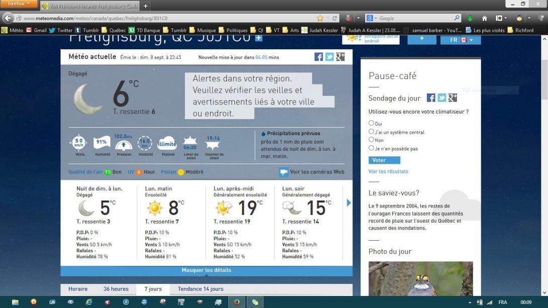 Sun.8.Sep: 7.48 NOT ONE! NOT ONE FUCKING REPLY TO MY TWITTER REQUEST FOR INFORMATION ON HOW BEST TO CARE FOR THE KITTEN!!!!! NOT ONE FUCKING LAZY CUNT OR PRICK COULD TYPE ANYTHING AT ALL! NOT ONE! FUCK FUCK FUCK FUCK FUCK FUCK FUCK!!! OK? BULLSHIT! THE ENTIRE LOT OF THEM! PLAIN, SIMPLE BULLSHIT! 4-FUCKING-HUNDRED AND NINETY-FUCKING-SEVEN FUCK-ALL FUCKTARDS. MISERABLE BLOODY SHITS! You know what? I don’t NEED and I don’t WANT ANY more disappointments. – Had a dream last night (or maybe it was this morning): I’d moved out of the place that I’d been living in, and attended some sort of concert or something. Mostly of young kids. What-ever the event, that’s not clear now. But I was with someone I knew (female) some-how, who knew the guy who’d moved into the flat and I got an invite to go to the place. So, we did. Generally, it was raining through the whole dream, and rather dark, like night. When we got to the house (the flat was up-stairs in the house), the house was in rather disarray and we had to climb some old stairs to get to the flat. The place was, with the exception of new furniture in the bed-room which I only glanced at as we entered, as I’d left it. Things (furniture &c) were simply tossed all about, I’d moved-out under duress and didn’t have time to clean or tidy. This guy just left my things about and threw his stuff on top of it. But there was something about a small bird that had lived at the place and was in bad condition. I asked after it and was told “It’s fine! In fact, you can see that it’s been around the place (there were little foot-prints on something… I’m not sure what, something like sand) and it’s even grown to be brown already!” (The colour change from black to brown was understood in the dream to mean that the bird had grown and matured.) Then I asked after the 2 dogs who were there, in the house (Dixie and Ellie) and there they were, in the next room! I called for Dixie and as she got up to come to me, the guy looked at her, she stopped. He said “I don’t think it’s a good idea that they should get to think you’re back.” Then we got up, walked around the place and I asked about a puppy that they were nursing and a girl (Jeannine!) came by with a board of some kind in her arms and on it was the little puppy, sleeping there comfortably. So, the bird and all the animals were in good health and well-taken-care-of. I woke. – 8.07 The skies are clear. The sun is shining. The breeze is quite chilly this morning. Météo says 10 degrees, max. 14 with 30% chance of any rain. Over-all, a good day for a trip to Richford on the bike. The yard-work is caught-up for the most part. Nothing much that NEEDS to be done this morning. So, I figure, if I’m out by 10.00 I’ll be in town by 14.00. Leave by 15.00 and be back at the house here by 19.00. Well! There goes THIS day! Eh? – It’s interesting: The temperature in the rest of the house is rather on the comfy-warm side yet, come into this room (I’m just back from the loo) and it’s avertissementDeGel8sept2013 “SWEAT-SHIRT AND HOOD UP”. There’s a warm day and a mountain-top in the near future. – Well, 8.23 and I should be getting me together. Lyle is awake and up and about already (or, he slept on the sofa to nurse the kitten over-night… not sure which but will find out shortly). I’d wanted to make a quick, light wash this morning, but that’s not happening. But I’m out to see what the temperatures and weather are like from first person and then? Check the bikes and ON THE ROAD TO RICHFORD! ROAD TRIP! – Note: for some reason my hands are all swollen this morning.How odd. – 9.11 Just in from a smoke and a check of yesterday’s work (and the back “herb garden”). It must have poured last night! But all’s well with the yard-work.meteo8sept2013 It’s COLD out there! Indeed, it’s cold in this room. But there’s a North wind coming in and the sky’s gone cloudy. And the damp chill to the air, well… The forecast is for clear skies. I don’t know… maybe I should think in terms of coming down into Richford via St.Armand/Frelighsburg? That’ll take a considerable length of time and a climb up le Pinacle, if so. Well. We shall see. The latest I can leave from here is noon, which would bring me back to the house at 20.00 tonight. More biking in the dark. But, what has to be done has to be done. And it won’t be for much longer. – Lyle is snoozing on the sofa, Bob is some-where down-stairs. I manage to make it out the back door, round the house and back in… undetected. Randy is just waking. The house is quiet. Dixie and Ellie greeted me at the back door when I came in. Dixie, of course, is expecting to go out-side to play. (And my bowels are now kicking me about for the second time this morning. It’s going to be an interesting day… so it would seem. Much of this is probably due to too much thinking. I need to put that in check today.) – 24.11 Thinking got checked, indeed! Bob and I were out in the back-yard, looking about and talking, I told him that I was planning a trip to Richford. When we got back in the house, he offered the key to the car. When I declined he said: But it’s going to rain. I assured him, it’s only water. And thankfully, the matter got dropped.