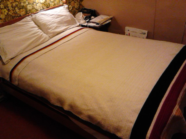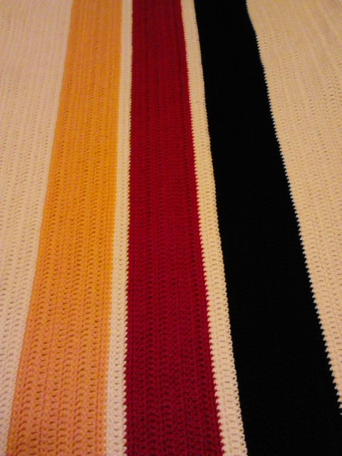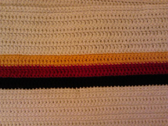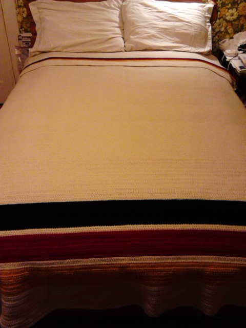 ***** SITTING ON THE BED…. UNDER THE AFGHAN!!! THE AFGHAN THAT WAS STARTED IN ROCKAWAY, AS A SIMPLE, QUICK-FIX AGAINST THE COLD THERE. IT’S RATHER “DONE” AT LAST! ALMOST 5 YEARS AFTER STARTING IT AND HAVING USED IT SEVERAL TIMES ALREADY… IT’S “DONE”… NOT “FINISHED” THOUGH. I WANT TO PUT A COUPLE OF ROWS OF BLACK, RED AND GOLD ON THE TOP. BUT… IT’S “DONE”! IT SURVIVED! THIS, AND THE FLIP FLOPS, A SHIRT AND A PAIR OF JEANS… AND THE “BATES” JACKET… NOT MUCH ELSE IS LEFT OF MY LIFE-TIME. BUT THIS AFGHAN… STARTED IN THE LITTLE ROOM IN ROCKAWAY, THE PLACE I CALLED “HOME” FOR A WHILE, HAVING GOTTEN MYSELF OUT OF THE HOMELESS SHELTER. And I’m SHOWERED, and the sheets on the bed are still clean. What a bloody-fucking shame it’s so fucking late! But… I’M UNDER THE AFGHAN AND IT’S “DONE”!!! – (And now to re-cap Wednesday…) – 1.37 I have to finish my tea but I’m exhausted! So, will have done with tea and then try for a nap. I’m slipping into those hypnogogic hallucinations at this hour. Time to call it quits. – AND… (on Friday, 10.Oct. at 7.45…) DONE, DONE, DONE, FINISHED, FINISHED, FINISHED, COMPLETED!!! ***** Aside from the lawn-mowing out front and the re-arranging and additions to the front decorations, and a quick stop to the market (for cottage cheese and sour cream… “dinner”) today, I confined me to the room and worked on this afghan until it was COMPLETE! AND IT IS COMPLETE! Took me until almost mid-night again, and my fingers show and feel it, but it’s done. Bitter-sweet, really. It’s the only vestige of Rockaway. In it are the memories of that little room in the old hotel. Barbara, the home care work… the Rock Park Hotel… the Homelessness and the fact that *I* removed me from the Shelter… *I* did it… alone! Not one person about to even so much as lend a hand. *I* got me back to work (at a fucking little job that paid shit for back-breaking work but…). *I* got me out and back on my feet… to the place where I actually enjoyed my time… for a brief while, but I was truly happy then and there. This afghan still has the open ocean, the sand, the music. It was a time when I could prepare meals, eat properly, sketch… It has Tilden in it. The art, the music, the ocean breezes, the pounding waves, the Bakfort. It’s all there. It has delightful nights and wonderful mornings of walking the boards to and from work. It has Willie and the Q22 in it. It has the hours of enjoyment. It has the bitter-sweet moments of missing the wonderful guys met and with whom I share the Shelter.